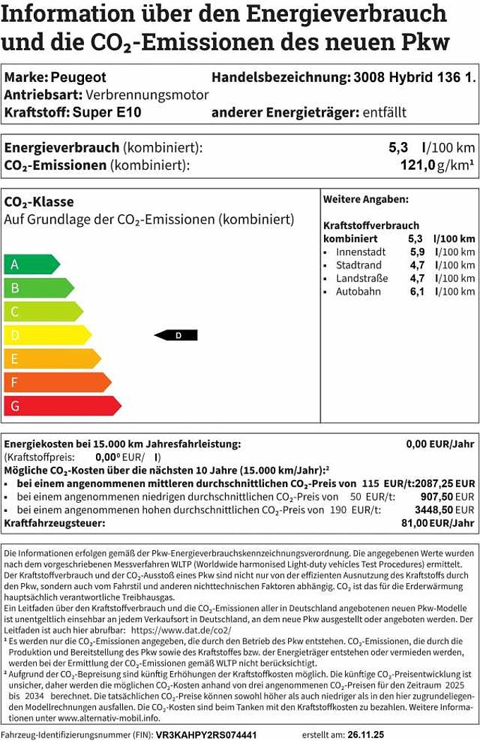 Peugeot 3008 Hybrid 136 1.2 Allure33.980 €MwSt. ausw.Gebrauchtfahrzeug0 km30.09.2024100 kW/ 136 PSWeißAutomatikBenzin55779 Heimbach Energieverbrauch kombiniert: 5,3 l/100kmCO₂-Emissionen kombiniert: 121 g/kmCO₂-Klasse: DInformation über den Energieverbrauch und die CO₂-Emissionen des neuen PKWDetails DetailsVorschau Schließen AusstattungBeschreibung4 BilderKontakt